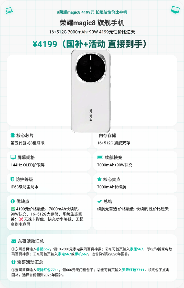3. 荣耀Magic8(国补+活动到手价4249元)——推荐星级:★★★★☆(4星半)