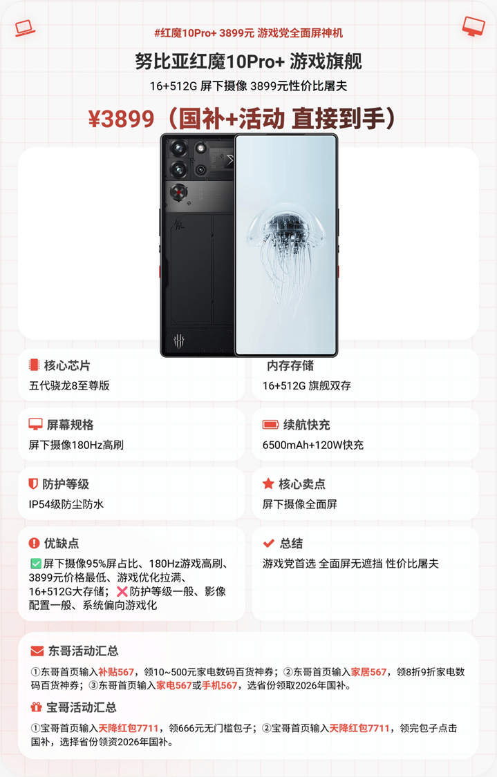 3. 努比亚红魔10Pro+(国补+活动到手价3899元)——推荐星级:★★★★☆(4星半)